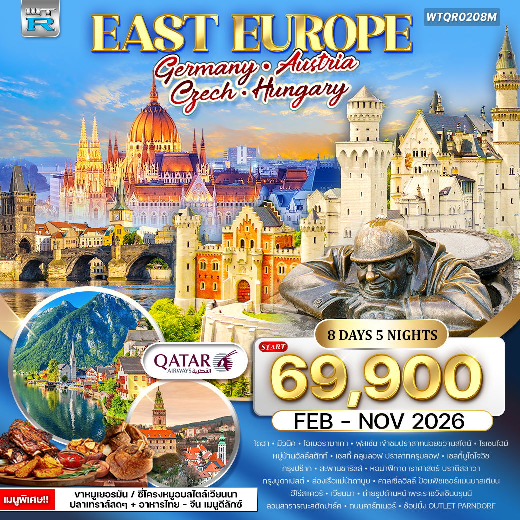 ชมมหาวิหารเซนต์วิตัส - ชมสะพานชาร์ลส์ - ชมหอนาฬิกาดาราศาสตร์ - ชมเมืองเชสกี้ คลุมลอฟ - ชมปราสาทครุมลอฟ - ชมเมืองซอลส์เบิร์ก - ชมหมู่บ้านฮัลล์สตัทท์ - ชมเมืองฟุสเซ่น - เข้าชมปราสาทนอยชวานสไตน์ - ขมเมืองมิวนิค - ช้อปปิ้งจัตุรัสมาเรียนพลัทซ์